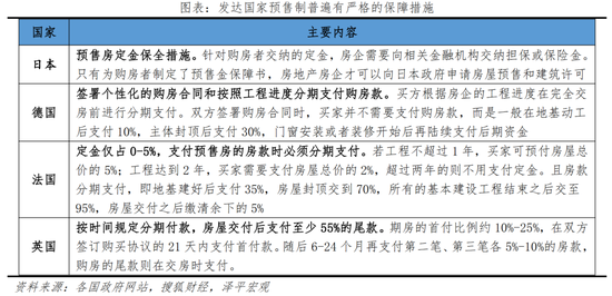 世界很多国家存在住房预售制,各国市场发展状况、行业环境的不同导致预售制的具体内容存在较大差异,发达国家普遍有严格的资金监管、分期支付以及违约处罚措施作为保障。房企在项目获得政府批准后才可以开始销售,但买家在购买期房后并非像中国一样在支付完首付款后从银行一次性贷款支付房款,而是根据工程进度在完全交房前进行分期支付。如果房企因故延迟了工程进度,购房者可以和房企协商以推迟付款,并要求房企给予一定的补偿措施。此外,如果房企无法在合同规定的日期内交付,购房者可根据合同要求退款或赔偿。