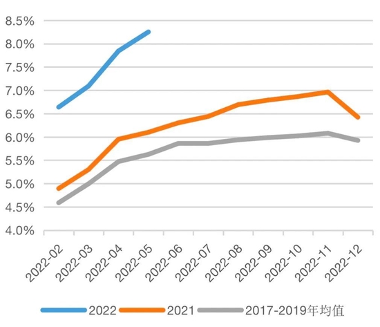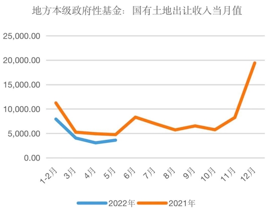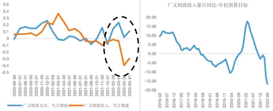按照年初财政部在预算报告中提出的目标,2022年广义财政预算收入增速为2.8%,广义财政支出增速为12.8%。如图5所示,年初至今广义财政支出的表现大致等于预算目标水平,而广义财政收入的增速则大幅低于全年的预算目标水平,广义财政面临较大的收支缺口。