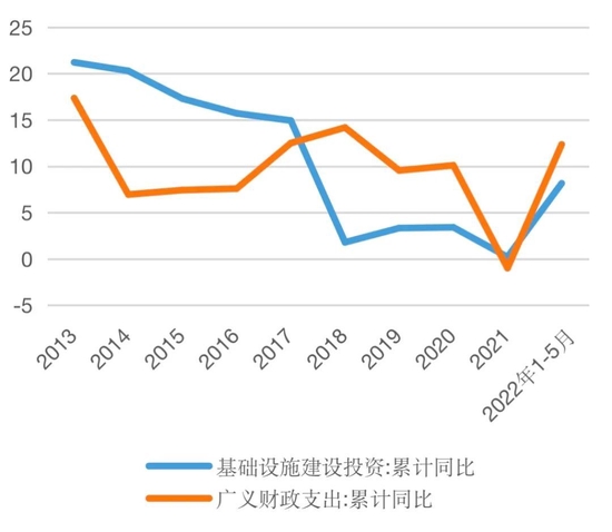 值得注意的是,本轮政府部门发力的过程中,基建投资与广义财政支出的联动性明显增强。在此之前,广义财政支出强度与基建投资的表现并无稳定的关系,前者并非后者的必要条件,更非充分条件。如图3所示,2013-2017年,基建投资年均增速为17.3%,而广义财政支出增速只有10%左右,且个别年份还不到基建投资增速的一半。2018-2020年,基建投资年均增速只有2.8%,广义财政支出年均增速则达到11.3%的水平。