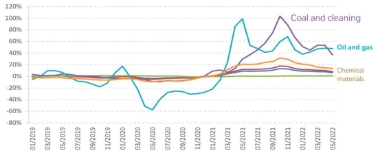 中国的煤炭价格自2021年开始迅速上涨,2021年10月达到13.5%的峰值。煤炭价格成为导致2021年10月中国PPI增速达到创纪录高度的最重要原因之一。2021年煤炭价格飙升的前因后果大家都很清楚,这里不再赘述。简言之,煤炭价格飙升也主要是供给减少而不是需求增加导致的。化工产品价格上升同油气价格上升的原因应该也是大致相同的。