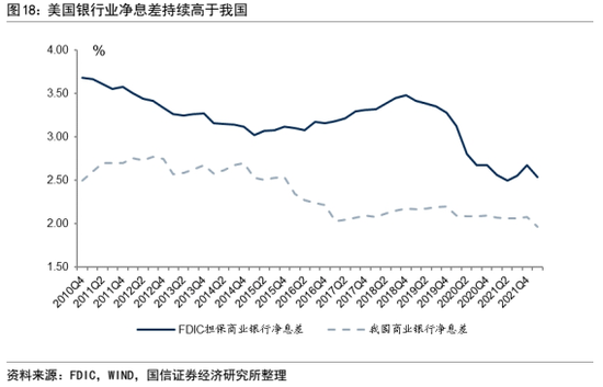 美国利率市场化程度高,存款利率跟随市场利率变动,同时,由于不计息存款和低息活期存款比例高,使得次贷危机后美国存款利率长期处在低位。2021年末摩根大通、富国银行、美国合众银行和硅谷银行存款成本分别是0.03%、0.04%、0.10%和0.14%。2022年一季度美国商业银行净息差2.54%,明显高于我国1.97%的水平,一方面就是美国存款成本明显低于我国,另一方面是资产风险定价能力强,贷款收益率在低利率市场环境下仍处于较高水平。