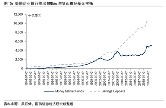 MMDAs的推出看似在一定程度上抬升了存款的利率(MMDAs利率高于其他储蓄存款利率),但由于对货币基金产生了较强的替代作用,MMDAs重新把银行融资链条从“客户—货币市场基金—银行”缩短为“客户—银行”,货币市场基金压缩又相应减持了大额存单,资金直接以低息的MMDAs形式流入银行,这在一定程度上降低了银行存款综合成本。因此,MMDAs不仅实现了存款利率与货币市场利率的有效联动,还对稳定存款成本和避免存款流失起到了重要作用,是美国利率市场化进程中的关键一步。