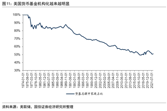 美国储蓄存款余额中货币市场存款账户(MMDAs)比重处在高位,商业银行创设MMDAs主要是为了应对货币市场基金(MMF)的冲击。美国国会于1970年取消了“Q”条例中关于10万美元以上存款利率最高限制的规定,但却造成对存款小户的利率歧视,1972年美国第一只货币市场基金应运而生。20世纪70年代末,由于连续几年的通货膨胀导致市场利率剧增,货币市场工具如国库券和商业票据的收益率超过了10%,但由于美国Q条例对存款利率上限修是一个循序渐进的过程,因此改革进程中存款仍然受利率上限的限制,于是出现储蓄存款不断流向货币市场基金的现象,货币市场基金从1977年的不足40亿美元跃升到1982年三季度末的约2400亿美元。除了储蓄替代功能,支付功能创新对于货币基金市场的繁荣一样功不可没,著名的富达基金在1974年就率先推出了可以开支票的货币基金,开创性的增加了货币市场基金的支付功能。之后货币市场基金发展到可以即时赎回、即时到账,且投资者还可以直接支付消费账单,通过ATM提取资金等。2008年末货币基金规模高达3.83万亿美元,2022年一季度末达到5.09万亿美元。