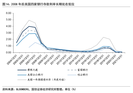 2008年次贷危机后美国进入低利率环境,存款成本长期处在低位。美国利率市场化程度高,存款利率跟随市场利率变动,同时,由于美国存款中包括大比例的不计息活期存款和低息活期存款,因此次贷危机后美国存款成本处在低位。以摩根大通、富国银行、美国合众银行和硅谷银行为例,2008年次贷危机后美国实施零利率,且同步实施四轮量化宽松政策(QE),四家银行存款成本也大幅下行,2015年末四家银行存款成本分别降到0.13%、0.11%、0.21%和0.06%。2015年底至2018年美国进入加息周期,四家银行存款成本也跟随上行,2018年末四家银行存款成本分别提升至0.72%、0.77%、0.94%和0.48%,但仍处在低位。2020年疫情冲击后美国再次实施零利率,且实施无限量的量化宽松政策,美国四家银行存款成本也基本降到零利率,2021年末四家银行存款成本分别是0.03%、0.04%、0.10%和0.14%。