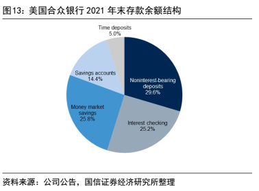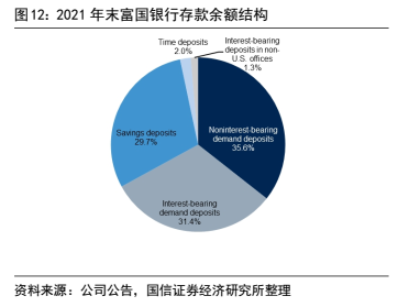 以富国银行和美国合众银行为例,两家银行活期存款(包括非计息活期存款和低息活期存款)和储蓄存款(MMDAs)比重超过90%。2021年末富国银行存款结构:非计息存款比重35.6%、计息活期存款比重31.4%、储蓄存款(包括MMDAs)比重为29.7%,定期存款比重为2.0%,其他存款比重为1.3%。2021年末美国合众银行存款结构:非计息存款比重29.6%、计息支票账户为25.2%、MMDAs比重为25.8%、其他储蓄存款比重为14.4%、定期存款比重为5.0%。