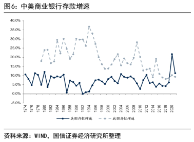 整体而言,美国商业银行负债结构变迁主要受到银行负债成本、资产端资产配置行为、经济形势等多因素共同作用。与我国商业银行相比,长期以来美国银行存款增速以及占总负债比重都不及我国,这与我国间接融资体系以及居民高储蓄意愿等因素相关。但近年来随着我国存款利率市场化不断提升以及居民投资渠道多元化,我国商业银行存款增速以及占总负债比重均持续回落,已低于美国商业银行存款比重。因此,我国商业银行当前面临着1970年代以来美国商业银行面临的存款流失和利率市场化后存款成本上行的压力。