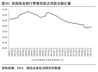 ■ 第二阶段,2008年次贷危机以来,存款占总负债比重持续提升,提升至2021年末的87.1%。次贷危机后居民资产大幅缩水且风险偏好持续下降,导致居民更愿持有低风险的存款资产,居民储蓄率持续提升。另外,次贷危机后监管机构加大了对美国商业银行创新业务的监管,促使美国商业银行回归传统业务,因此商业银行通过非存款方式融资的需求下降。