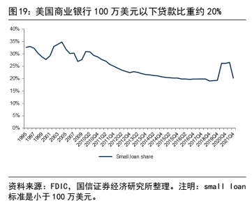 利率市场化后存款比重持续下行,一方面是货币市场基金(MMF)诞生且发展迅猛,存款大量流向MMF,另一方面是银行间市场融资更加便捷,尤其是1990年代后混业经营下非信贷类业务快速发展,银行加大了借入资金、交易负债和次级债务等融资规模,带来存款比重下降。2008年后存款比重又持续上行,主要是居民资产大幅缩水且风险偏好下降。另外,监管机构加大了对创新业务的监管,促使银行回归传统业务,因此非存款融资需求下降。个股来看,2021年末摩根大通、富国银行、美国合众银行以及硅谷银行存款占总负债的比重分别为71.4%、84.3%、88.1%和97.1%,中小银行存款比重更高。