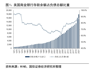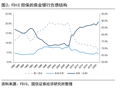 ■ 存款是美国银行业负债的核心部分,存款占总负债比重由1970年代初期的约95%降至2008年末的63%,此后又进入持续上行阶段,2021年末达87%。