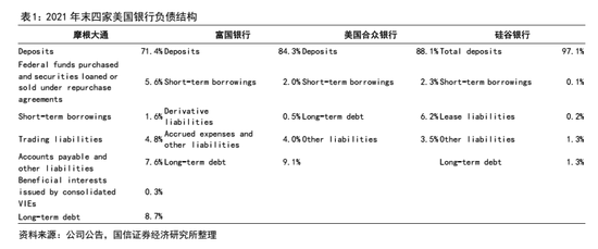 我们主要选取摩根大通、富国银行、美国合众银行以及硅谷银行四家代表性银行为样本,分析不同类型银行负债结构。2021年末四家银行总资产规模分别为3.74万亿美元、1.95万亿美元和0.57万亿美元和0.21万亿美元。从四家银行2021年末负债结构来看,存款是美国银行业负债的核心部分,且规模越小的银行存款比重越高。2021年末摩根大通、富国银行、美国合众银行以及硅谷银行存款占总负债的比重分别为71.4%、84.3%、88.1%和97.1%。