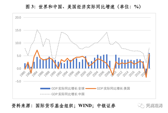 新冠肺炎疫情暴发的2020年,世界经济衰退3.1%,跌幅远超2009年的0.1%,2021年增长6.1%,仅略超过2010年的5.4%。到2021年,世界经济实物量已恢复到疫情前水平,但仍有近一半经济体低于2019年。2020~2021年,全球经济两年复合平均增长1.4%,低于2015~2019年趋势值2.0个百分点,有近九成经济体低于五年趋势值。如美国,2020年衰退3.4%,2021年增长5.7%,两年复合平均仅有1.0%,低于五年趋势值1.3个百分点(见图3)。