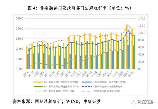 经过2008和2020年两次空中加油后,全球非金融部门特别是政府部门均已债台高筑,进一步加杠杆的能力和意愿有限(见图4)。而且,各国基本已将经济刺激手段用到极致,政策公信力严重受损,危机有可能会预期自我强化、自我实现。若末日博士鲁比尼一语成谶,全球爆发经济、债务双重危机,“日本病”缠身的资产负债表衰退恐难避免。届时,全球央行头疼的可能不是通胀而是通缩了。