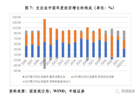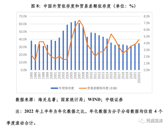 过去两年,外需对中国经济增长的贡献率平均为23.2%,今年上半年更是高达35.8%,远高于2015~2019年平均1.1%的水平,也高于2004~2008年的趋势值6.1%(见图7)。尤其是今年二季度中国经济同比增长0.4%,全靠外需对经济增长拉动1.0个百分点力挽狂澜。