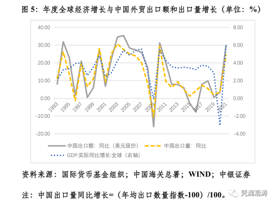 从实证角度看,长期以来,中国出口对人民币汇率不敏感而是对外需敏感。将全球经济实际增长分别与中国出口额(美元现价)和出口量增长做相关性分析结果显示:1993~2021年二者均为高度正相关,相关性分别为0.979和0.984,其中2009~2021年分别为0.866和0.969(见图5)。可见,2008年金融危机以来,全球经济增长与中国出口额的相关性边际上减弱但仍属强相关,与中国出口量则依然高度正相关。