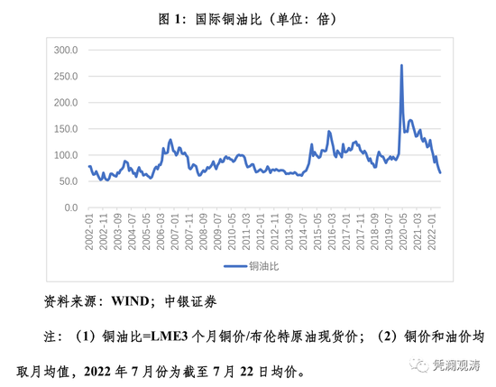 今年7月份,月均铜油比为66.3倍,较上年底下降48%,跌至2014年7月以来的新低(见图1)。这反映宏观需求走弱,全球经济衰退概率提升。同期,美国和欧元区Markit综合PMI指数均跌破荣枯线。近日10年期美债收益率连续下挫,7月22日收在2.77%。