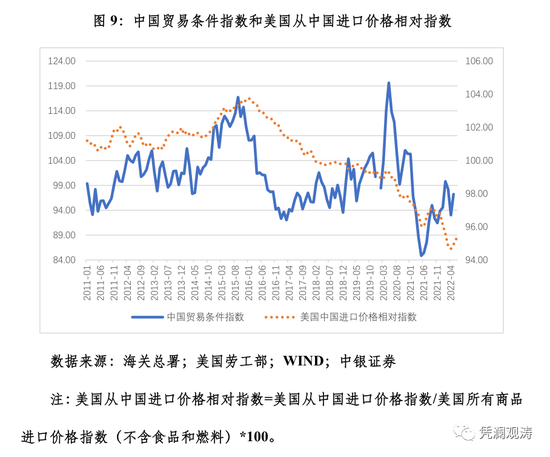 全球买中国商品,本应利好中国出口商定价。但自去年2月以来,中国贸易条件指数持续低于100,表明出口价格上涨跟不上进口成本的上升。美国从中国进口价格相对指数2018年以来持续低于100,今年上半年平均为95.23,较2021年全年均值低1.6%,较2019年低4.3%,表明中国货相对其他外国货在美国卖得也没有那么“俏”(见图9)。这与国内需求不足,中国企业更多依靠国际市场消化产能,造成出口部门过度竞争有关。