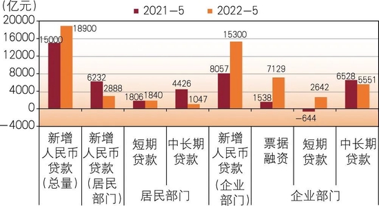 随着疫情形势的好转,一揽子措施落地实施,企业复工复产加快推进,此前受疫情影响严重地区的经济活跃度明显提升。5月,实体经济出现一定的好转迹象,新增信贷总量也出现了明显反弹。5月人民币贷款增加了1.89万亿元,同比多增3920亿元,但信贷结构仍然不够理想。就居民部门而言,5月贷款由上月的减少转为增加2888亿元,但仍比2021年同期少增3344亿元。其中,中长期贷款仅增加了1047亿元,比2021年同期少增3379亿元,说明居民的购房需求仍然偏弱。就企业部门而言,5月贷款增加1.53万亿元,比2021年同期多增7291亿元,但多增的部分仍然是短期贷款和票据融资。短期贷款增加2642亿元,比2021年同期多增3286亿元。票据融资增加7129亿元,比2021年同期多增5591亿元,月度新增票据融资规模创下有数据记录以来的新高。而中长期贷款增加5551亿元,仍比2021年同期少增近1000亿元(见图5)。