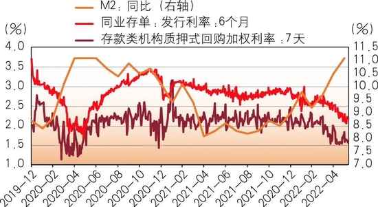 图3 2019年12月至2022年4月M2增速和回购、存单利率