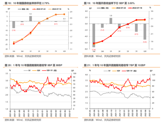 本周长债收益率整体持平。全周来看,10年期国债收益率持平在2.79%,10年国开债收益率下行5BP至3.00%。1年与10年国债期限利差收窄5BP至88BP,1年与10年国开债期限利差收窄7BP至102BP。