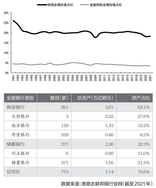 德国银行业由三支柱体系构成,商业银行、储蓄银行、信用社为三支柱。这种三支柱的银行体系不同支柱之间存在较大差异,且多数银行需遵从严格的区域经营原则,禁止跨区经营;跨区域、跨支柱的并购也受到一定的法律限制,银行只被允许在地理位置临近的区域开展并购,且需在联邦卡特尔局的监管下对企业并购和集团垄断行为进行严格把控,从而确保银行机构的多样化。因此,不同类别的银行机构可以从不同维度去服务实体经济,差异化展业并实现较为全面的覆盖,避免了全部银行都去“垒大户”的现象发生。得益于这种独特而高度稳定的三支柱银行体系,德国较好地处理了金融服务与实体经济之间的关系,有效控制了房地产风险,取得了较好成效。德国制造业增加值占国内生产总值(GDP)比重稳居发达经济体前列,近30年始终保持在20%左右,2021年德国制造业增加值占国内生产总值比重为18.26%;而金融业占比始终保持较低水平并呈下降趋势,2021年德国金融业增加值占GDP比重仅为3.42%。