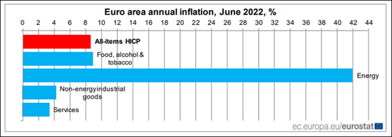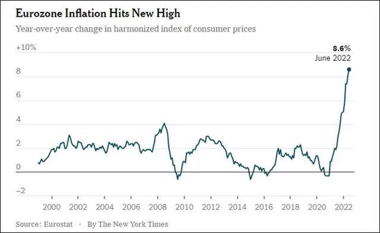 欧元过度贬值会给欧元区带来一系列问题,因此为了避免欧元过度贬值,欧洲央行必须要加息,进行对冲。更重要的是通胀,欧元区6月年化通胀率高达8.6%,像德国等一些对通胀高度厌恶的国家,通胀率也达到了很高水平。