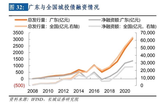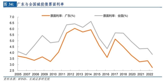 全国城投债票面利率自2018年以来进入持续下滑的趋势。同花顺数据显示,2021年全国城投债票面利率为4.36%,较2018年下滑128BP;而广东城投债利率长期低于全国水平,且自2018年以来呈现相近的下滑趋势,较2018年下滑117BP,发行成本进一步压缩。今年截至7月31日,广东省城投债票面利率为2.76%,比全国利率低110BP,远低于全国水平。