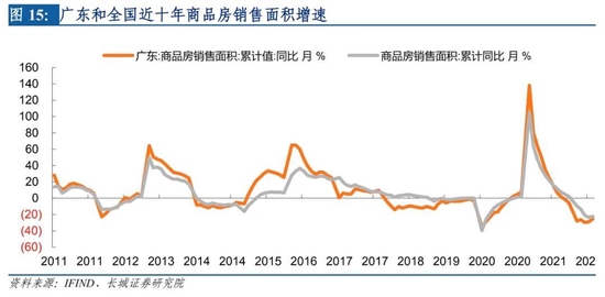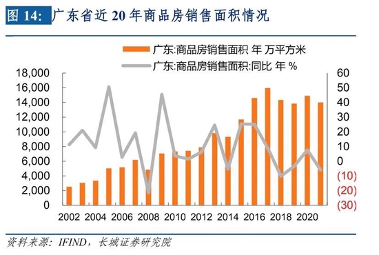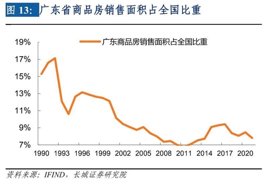 房地产销售方面,广东省房地产业发展较早,90年代至2000年,商品房销售面积占全国比重一直较高;2000年以来占比持续下降但2011年以后重新上升,从2018年以来再次持续下降。2021年,广东省商品房销售面积从2012年的7899万方增长到14011万方;广东省商品房销售面积占全国的比重回落至7.8%。