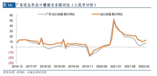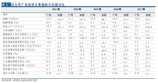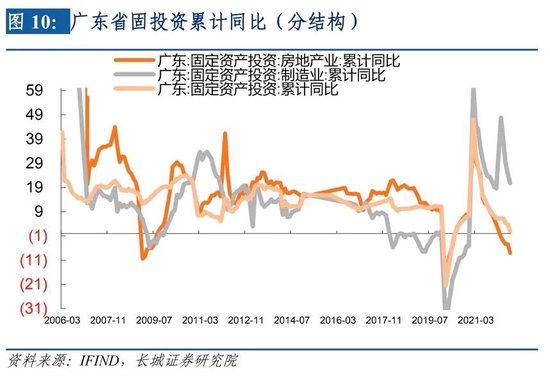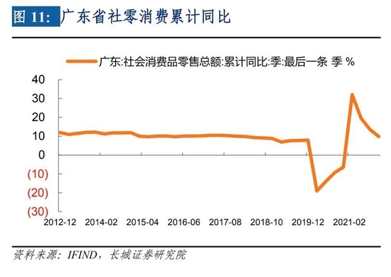 消费方面看,广东社消总额领先全国。2021年广东全体居民人均可支配收入为44993元,排名全国第六位。2021年广东社会消费品零售总额4.42万亿元,继续领先江苏、浙江,位居全国第一;但同比增速9.9%,低于全国平均增速(12.5%),更低于江苏增速(15.1%)。2022年上半年广东消费总额2.17万亿元,同比增长0.9%,高于全国水平(-0.7%)。4月份以来,经历疫情冲击之后消费市场有序复苏,今年上半年广东汽车类商品零售额增长0.4%,其中新能源汽车增长150.8%。以新能源汽车为代表的新消费品成为消费热点,尤其是在广州、深圳增加汽车牌照指标后,以旧换新购置新能源汽车可获补贴等政策起到了一定刺激作用。