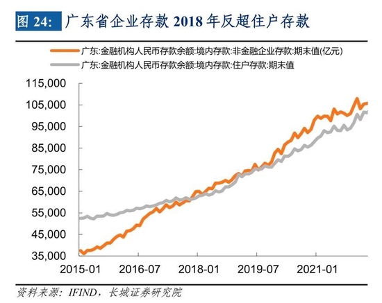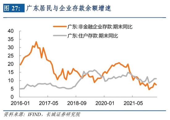 分阶段来看,2010年-2016年,广东省人口增速整体下行,存款增速基本也保持相似的节奏,但2017年至2021年,虽然人口增速依然下降,广东省存款余额同比增速却逆势上涨。分析广东省存款结构,我们认为可能是企业部门融资活动对存款的拉动。