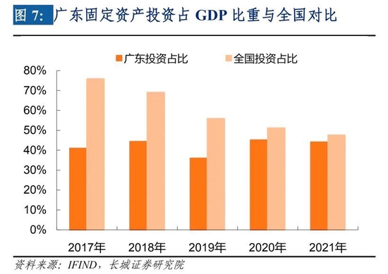 投资角度看,广东省固定资产投资增速较为平稳。从2012年的1.92万亿元稳步增长至2021年的4.47万亿元,年均增速达9.8%。2021年固定资产投资占GDP比重为35.9%,占全国总投资完成额的 8.2%。近五年全国固定资产投资占GDP比重持续下行,而广东省投资占GDP比重基本保持稳定且持续低于全国水平。受疫情冲击,2020年广东省固定资产投资增速由2019年的11.1%降至7.2%,2021年固投增速继续下降至6.3%,但仍旧高于全国增速。今年疫情冲击再次显现,前六个月广东省固定资产投资同比1%,比全国低5.1个百分点。