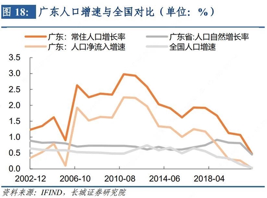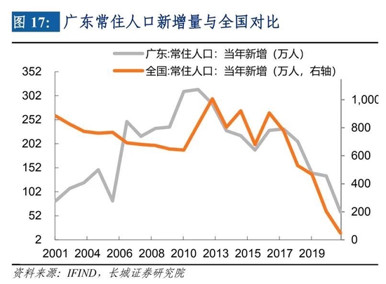 广东人口净流入增速有所放缓。2021年广东常住人口新增人数逐年降低,仅比上年末增加 60万人,为广东省近十年以来新增人口的最低值,并且新增人口数量其中大部分来自于自然增长,广东自然增长率为4.52‰,远高于全国自然增长率(0.34‰)。