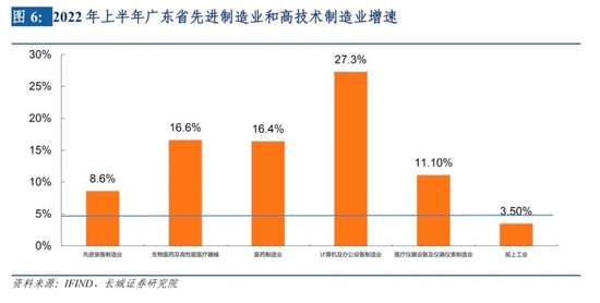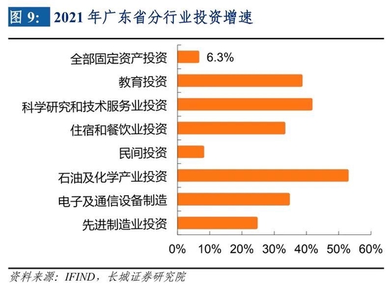 广东省投资结构不断优化。广东省发展改革委副主任黄华东在广东经济社会发展成就系列新闻发布会上表示,2017至2021五年间基础设施投资年均增长达9.6%,高技术产业投资年均增长11.8%,高于投资的整体增速(8.8%)。广东统计局数据显示,2022年上半年,广东房地产开发投资额0.75万亿元,同比下降8.1%,而制造业投资增长20.8%,有力拉动固定资产投资。制造业新动能投资持续快速增长,高技术制造业投资增长38.8%,占制造业投资比重36.0%,先进制造业投资增长30.3%,占制造业投资比重64.9%,占比均比一季度提高。