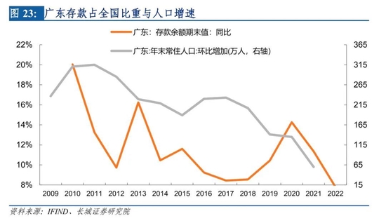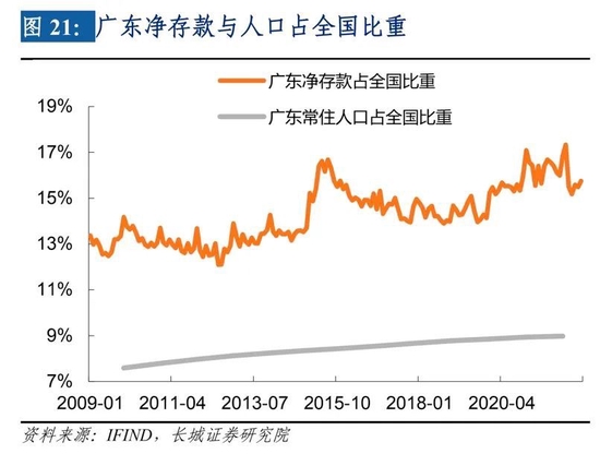广东省对企业和人口的吸引充分体现在其对资金的聚拢能力之中。2021年广东省以不足全国9%的人口,吸拢了全国约16%的净存款。广东省净存款(存款余额-贷款余额)占全国比重从2009年的13%稳步上涨至16%以上,今年1月份一度上涨至17.3%。