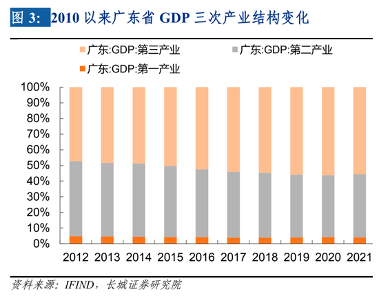 2021年广东三次产业占比为4.0:40.4:55.6,相比于全国的7.3:39.4:53.3,三产占比明显较高,并且广东第三产业占GDP 比重逐年上升,从 2012 年的 44.33%升至 2021 年的55.6%,其中2020年占比更是高达56.5%,对GDP增长贡献率达59.9%,显示广东有效应对新冠疫情的冲击。广东省大力推动在线教育、远程办公、快递+直播带货等新产业、新业态,使得服务业发展步伐迅速加快。