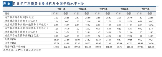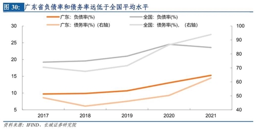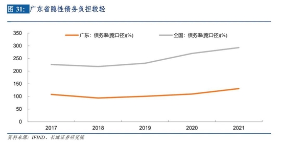 将城投债余额也纳入债务后,广东宽口径债务率也处于较低水平。近五年,广东省宽口径债务率与全国平均水平走势相近,呈现小幅上升趋势,但始终远低于全国平均水平,折射出广东省隐性债务负担较轻。2021年广东省宽口径债务率为130.95%,全国各省平均水平为292.85%。