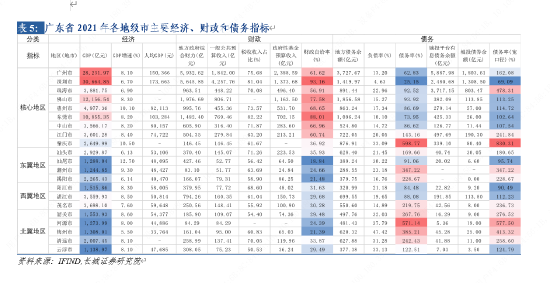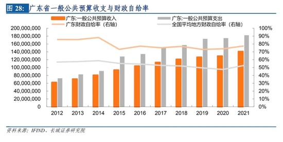 广东省财政实力雄厚,并且对土地的依赖程度中等。我们以成交土地出让金占地方公共财政收入的比例来近似衡量土地依赖程度,从2021年数据来看,广东的土地依赖度居全国各省市中等偏下水平,事实上近10年以来其土地依赖度一直低于30个省市的平均水平,体现出广东省整体财政收入相对稳健。