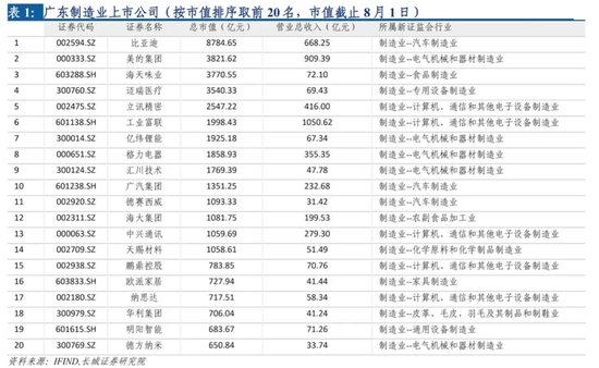 广东省制造业发达,坐拥一大批卓越的制造业企业,其中不乏市值超千亿或收入超百亿的“超级公司”如比亚迪、美的集团、格力电器、迈瑞医疗、立讯精密等, 涵盖汽车制造、医药制造、电器机械、计算机通信等多个行业,也为广东高端制造业的高速发展提供动力。