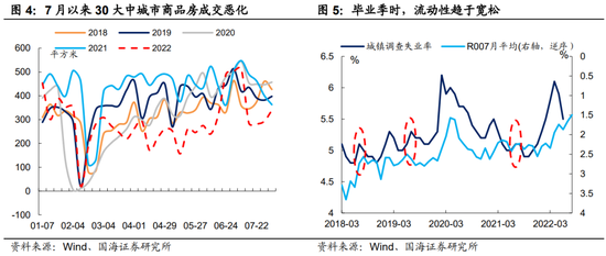 除了地产防风险的角度之外,在报告《三季度资金面怎么看?》中我们也指出:7月份为大学生毕业季,从2018、2019年历史来看,毕业季时总体失业情况倾向于上行。而央行对于短期流动性的管理,与就业形势高度相关。因此在三季度就业市场仍不稳定的情况下,央行可能不会主动从银行间提取流动性,重演2020年6月份行情。