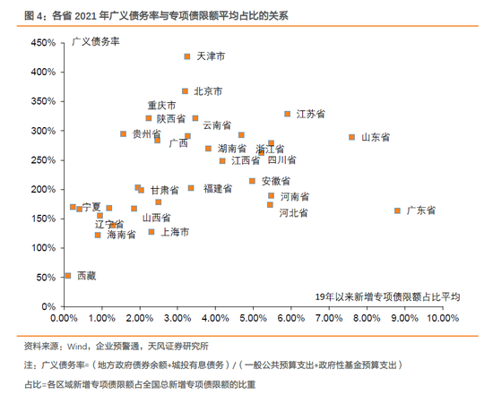 但经过我们梳理会发现在实际专项债限额分配中,在主要结合区域内经济财政实力进行分配的同时,一定程度上会向债务风险较高的地区倾斜,兼顾各地区平衡发展的诉求。