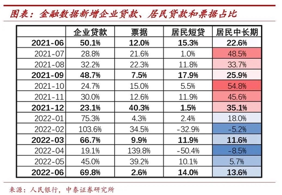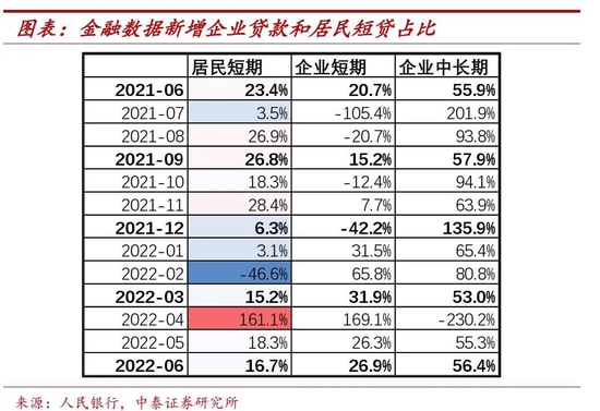 企业贷款利率环比降20bp:预计主要由新发放企业贷款定价下行带动。1、结构维度:预计对利率贡献保持稳定。6月中长期企业贷款占比较3月保持稳定。从社融数据看,6月新增企业中长期贷款占比达67.7%,较3月总体保持稳定。2、定价维度,由于结构总体保持稳定,可以判断新发放企业贷款的定价有较大程度下移。一方面,5月5年期LPR有15bp的下行,直接带动中长期企业贷款定价下移;另一方面从供需角度,二季度各地疫情有不同程度发散,企业的融资需求仍然维持在低位、4-5月银行新增贷款仍是较大比例的投向票据,供给相对充裕、需求相对较弱的背景下,预计银行新发放的对公贷款利率仍是保持低位略降的趋势。