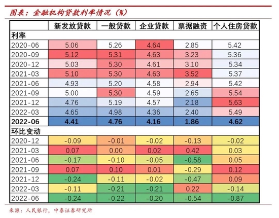 新发放贷款利率:各细项贷款新发利率均降至低位。2022年6月各项贷款新发放贷款利率均继续环比下行,企业贷款利率至有数据以来的历史低位,同时按揭贷款利率受LPR下行影响有较大降幅,降至2017年6月以来低位。新发放总贷款、一般贷款(不含票据和按揭)、企业贷款、票据、按揭利率分别为4.41%、4.76%、4.16%、1.86%和4.62%,环比3月变动-24bp、-22bp、-20bp、-54bp和-87bp。