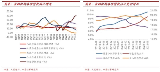 结构性货币政策继续发力:推动我国信贷结构缓慢演变。央行积极完善结构性货币政策工具体系,发挥信贷政策的结构引导作用。配合经济结构变迁和结构性货币工具,信贷结构逐步演变,更好促进实体经济发展。制造业中长期贷款自2020年6月以来持续保持 20%以上的高增速,比重从2010 年 17%趋势性下行至 2020年9%的势头得到遏制,22年中占比9.4%。普惠小微贷款余额达22万亿、从2019年占比总贷款7.6%上升至22年上半年10.6%,房地产贷款则从2019年占比29%下降到22年上半年25.7%。绿色信贷同比增速持续走高,22年中同比增40%,绿色信贷短期可以托底房地产贷款增速下滑带来的资产缺口;中长期看,绿色资产可以作为结构优化调整的产业体系补充。