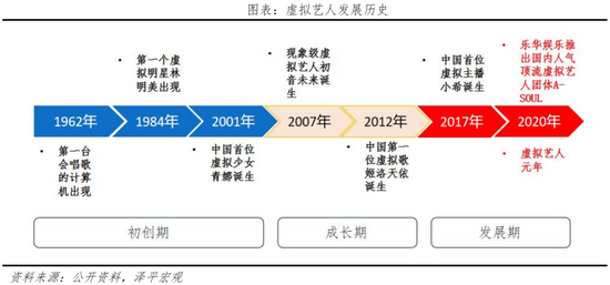 虚拟艺人起源于1962年,2007年初音未来成为世界上第一个使用全息投影技术举办演唱会的现象级虚拟艺人,行业迎来第一波热潮。我国虚拟艺人发展较晚,直到2020年经历了一众艺人“塌房”事件之后,虚拟艺人才获得了前所未有的关注。2020年被称为“虚拟艺人元年”,乐华娱乐联合字节跳动推出了国内超人气虚拟女团A-SOUL,打破人们对虚拟艺人的传统印象。