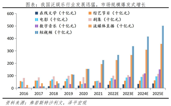 近年来,随着人均收入水平的提高,人们越来越重视精神生活的质量水平,我国城镇居民在教育、文化、娱乐服务层面的人均支出也在日益上升。叠加互联网等通信技术的进步,我国泛娱乐行业迎来井喷式的发展,根据弗若斯特沙利文的测算,包括短视频、流媒体直播、剧集、综艺节目、数字音乐、电影、在线文学及动画在内的中国泛娱乐市场规模从2016年的2442亿元增长至2021年的7003亿元,增长近2.9倍,年复合增速高达23.5%。未来消费升级推动娱乐需求进一步升级,消费者可以根据需求选择更专业化、特色化、细分化的娱乐供给,市场也将进一步保持高速增长态势。