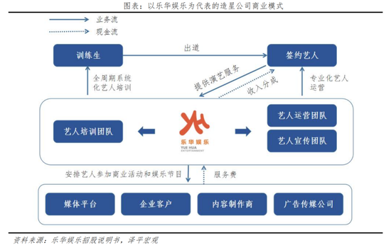 以国内头部造星公司乐华娱乐为例,其艺人管理模式涵盖从艺人培训、艺人运营到艺人宣传的整个艺人管理产业价值链:一是严格选拔训练生并对其进行全方位、高质量的课程培训;二是在约3-5年的训练周期后通过各种方式出道成为专业艺人;三是在出道后为艺人安排代言、商业宣传及其他商业货代等商业活动,以及出演电影、剧集及综艺节目等运营,从而帮助其提高商业价值,带来积极的社会影响,从而进一步提升自身的品牌影响力。