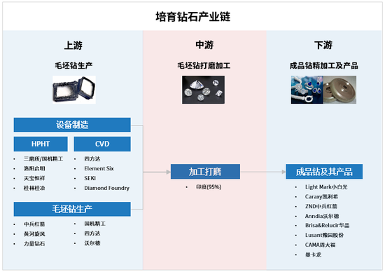 中国作为全球最大的培育钻石生产基地,其在全球分工链条中主要处于上游设备及生产端,但近年来随着技术的不断突破,小颗粒培育钻石品质已经可以与天然钻石相媲美,相关龙头厂商也在逐步尝试向下游精加工及应用领域延伸。