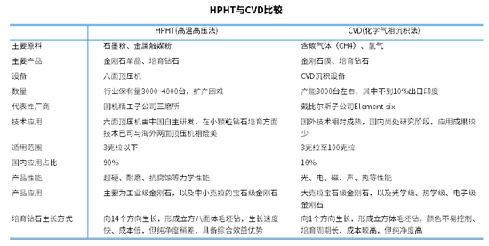当前,培育钻石生产的核心技术环节主要集中于上游的设备端,主流技术路径分为HPHT(高温高压法)和CVD(化学气相沉积法)两类。其中,中国一直以来都是沿用六面顶压机,即通过HPHT技术进行培育钻石合成,代表性厂商为国机精工子公司三磨所,除供给国内外近年来更是凭借精湛的技术和生产成本优势出口到美日韩等国家;而戴比尔斯子公司元素六等海外龙头厂商则主要以CVD为主流技术路径。