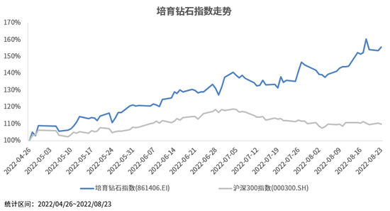 以2022/04/26为基期,至2022/08/23,培育钻石指数(861406.EI)累计涨幅达55.68%,跑赢同期沪深300指数45.72个百分点。