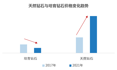 如今四年过去了,站在当前时点回看,戴比尔斯的策略似乎已取得阶段性胜利,培育钻石相对天然裸钻的折价率从2017年底的55%下降至2021年底的14%,期间绝对价格下降接近50%,而同期天然钻石价格却不降反升,呈现大幅增长。当前,培育钻石价格仅为天然钻石价格的10%~35%。