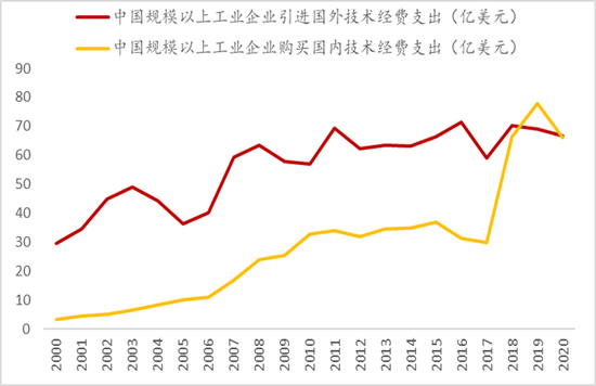 截至2020年,我国规上企业引进国外技术支出相比20年前扩大了近两倍,但大部分技术经费支出增量流向对国内技术的购买。面对外部环境变差的压力,我国在技术升级方面对自主研发的依赖度更强。但从经费支出及增速上看,我国制造业技术进步还有相当空间。